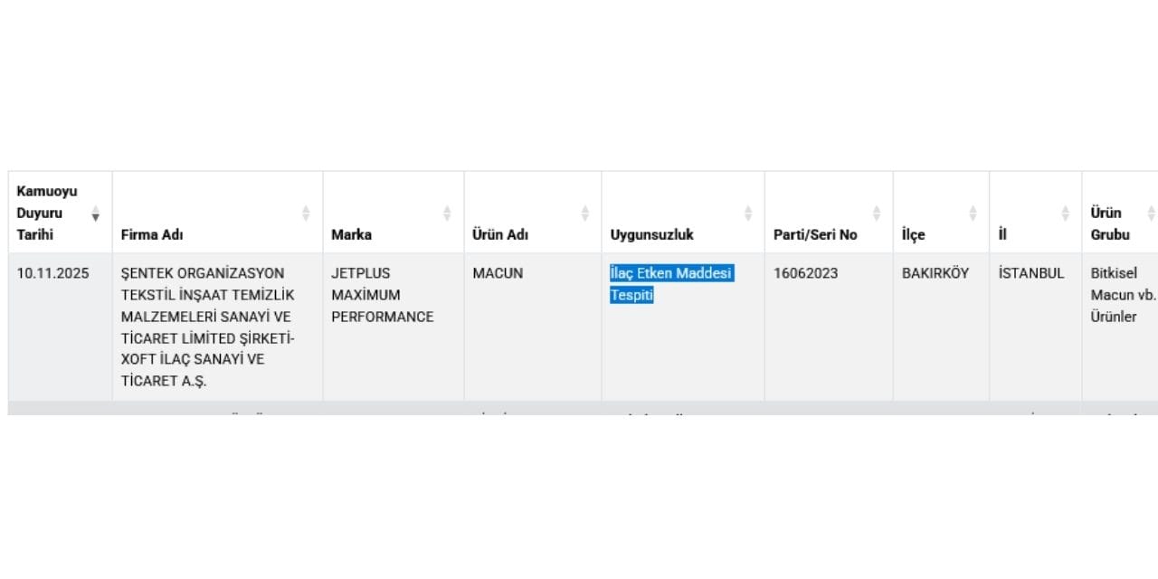 Güncellenen aynı listede ifşa edilen bir diğer ürün ise “Jetplus Maximum Performance” markalı macun oldu. Bu ürün üzerinde yapılan testler neticesinde, içeriğinde ilaç etken maddesi barındırdığı açıklandı.