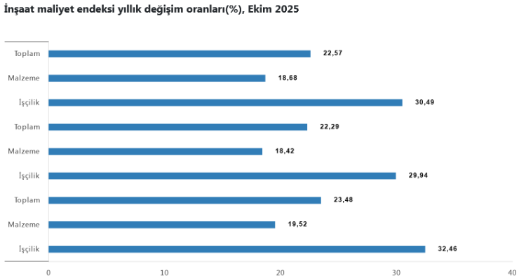 Bina inşaatı maliyet endeksi bir önceki aya göre yüzde 0,95, yıllık bazda ise yüzde 22,29 artış kaydetti. Aylık malzeme artışı yüzde 1,18, işçilik artışı yüzde 0,55 olurken; yıllık veriler malzemede yüzde 18,42, işçilikte ise yüzde 29,94 artışa işaret etti.