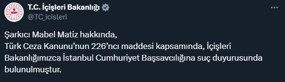 İçişleri Bakanlığı ise Matiz hakkında şarkısı nedeniyle suç duyurusunda bulundu. Bakanlıktan yapılan açıklamada “Şarkıcı Mabel Matiz hakkında, Türk Ceza Kanunu’nun 226’ncı maddesi kapsamında, İçişleri Bakanlığımızca İstanbul Cumhuriyet Başsavcılığına suç duyurusunda bulunulmuştur” denildi.