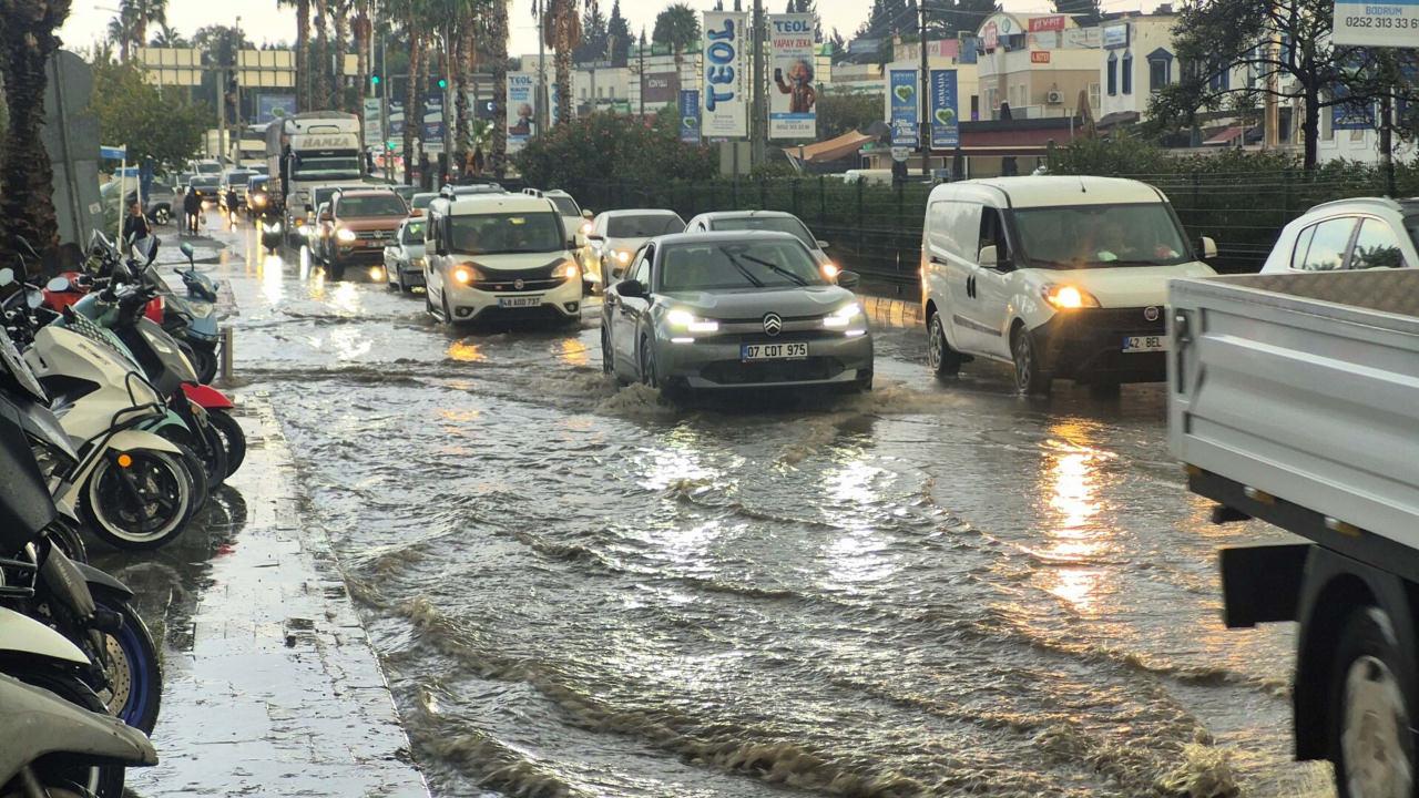 Muğla’nın Bodrum ilçesinde saat 16.00 sıralarında başlayan sağanak yağış, günlük yaşamı olumsuz etkiledi. Şiddetli yağış nedeniyle cadde ve sokaklar göle dönerken, tıkanan mazgalların taşmasıyla sürücüler trafikte ilerlemekte güçlük çekti.